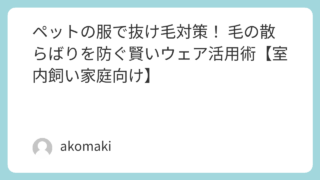 抜け毛対策 ペットの服で抜け毛対策! 毛の散らばりを防ぐ賢いウェア活用術【室内飼い家庭向け】 室内での抜け毛対策に悩む飼い主必見! ペットウェアを活用して毛の散らばりを防ぐ方法を徹底解説。 素材選び・着せ方・洗濯ケア・併用アイテムまで紹介。 毛とアレルギーの悩みを減らす快適生活術。 2025.12.01 抜け毛対策